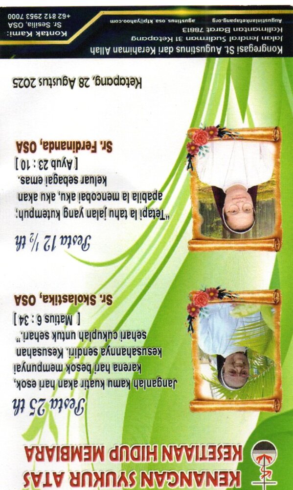 Kapel OSA Ketapang pada hari ini dipenuhi sukacita. Perayaan pesta Santo Agustinus yang agung semakin bermakna karena dirangkaikan dengan syukur atas kesetiaan hidup membiara dua suster: Sr. Skolastika, OSA yang telah 25 tahun menempuh jalan panggilan, serta Sr. Ferdinanda, OSA yang merayakan 12,5 tahun hidup bakti.